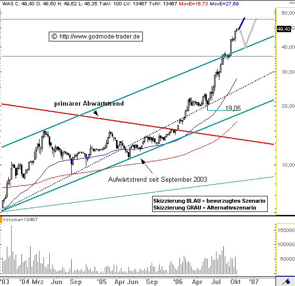 Rückblick: Die H+R WASAG Aktie befindet sich seit 2003 in einer deutliche Aufwärtsbewegung. Nach einem Tief bei 19,05 Euro im Mai 2005 beschleunigte sich die Bewegung massiv. Im September 2006 durchbrach die Aktie sogar die obere Begrenzung der Aufwärtsbewegung seit 2003 und zog direkt auf ein Hoch bei 50,25 Euro an. Von dort aus musste die Aktie in den letzten beiden Wochen starke Verluste hinnehmen. Auf der alten oberen Begrenzung bei aktuell 38,91 Euro dreht die Aktie in dieser Woche wieder nach oben.