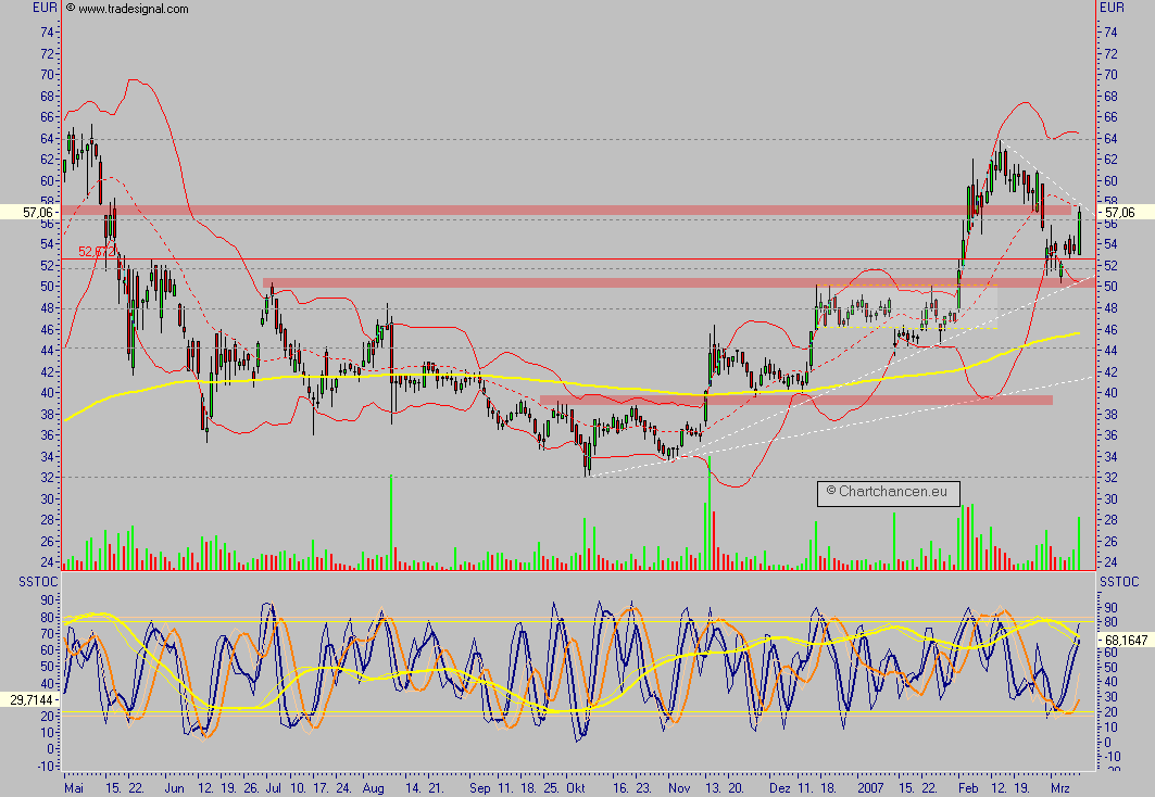 Darüber hinaus wird es bei Conergy jetzt wieder spannend, in # 106 schrieb ich: "über 50 bleibt der Chartausblick bullish", das Tief war 50,32, das Zwischenhoch bereits wieder 15 % höher, es zeigt letztlich, daß die Aktie sofort wieder gesucht wird.