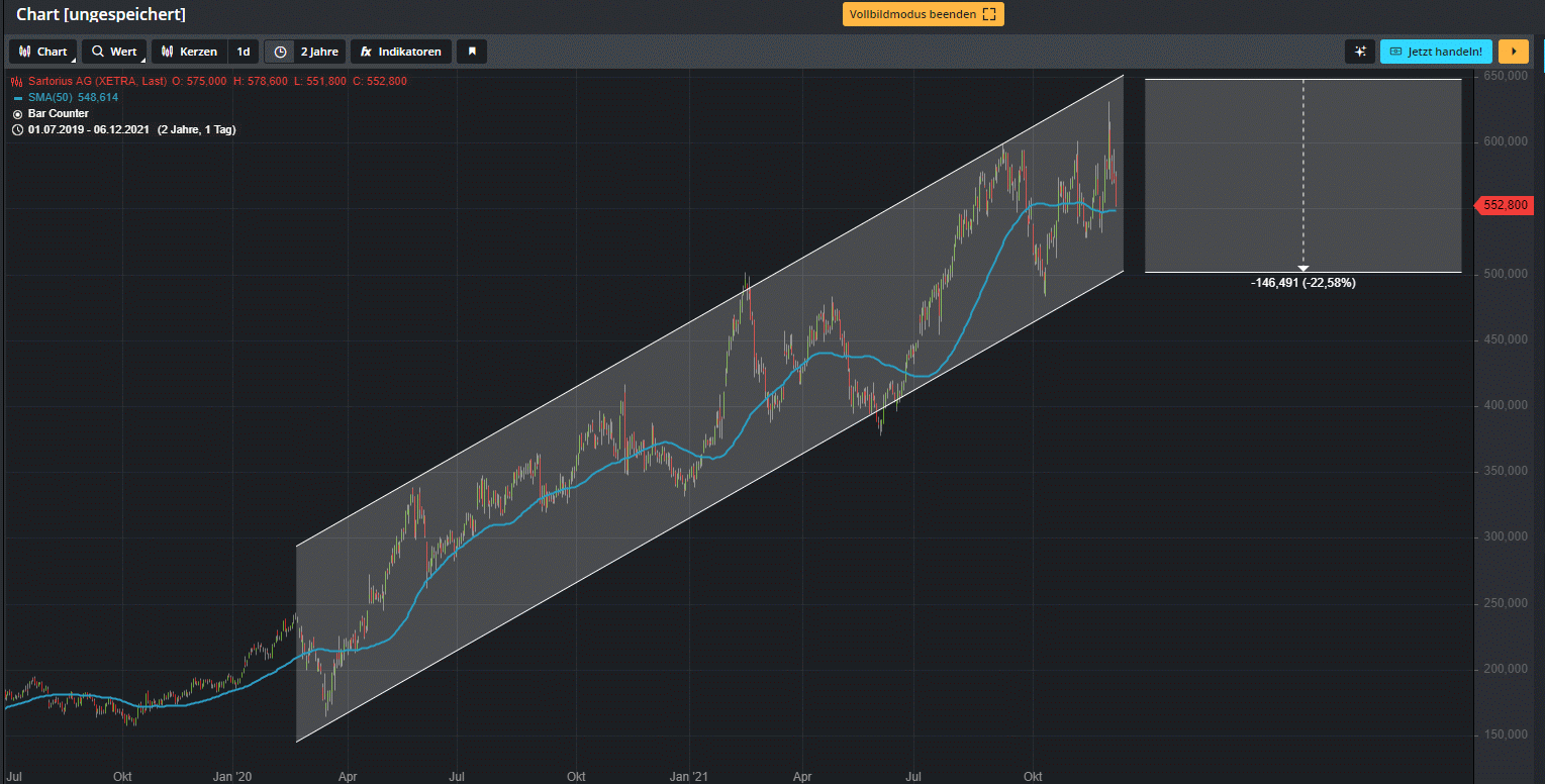 Dass die Reaktion der Anleger auf die Prognose enttäuschend verlief, liegt auch an der Bewertung der Aktie. Denn mit einem Gewinn pro Aktie von 8,08 Euro für das Geschäftsjahr 2021 ergibt sich für dieSartorius-Vorzugsaktie ein KGV (Kurs-Gewinn-Verhältnis) von 57,6. Für die Sartorius-Stammaktie, die niedriger notiert, ergibt sich ein KGV von 50,2.