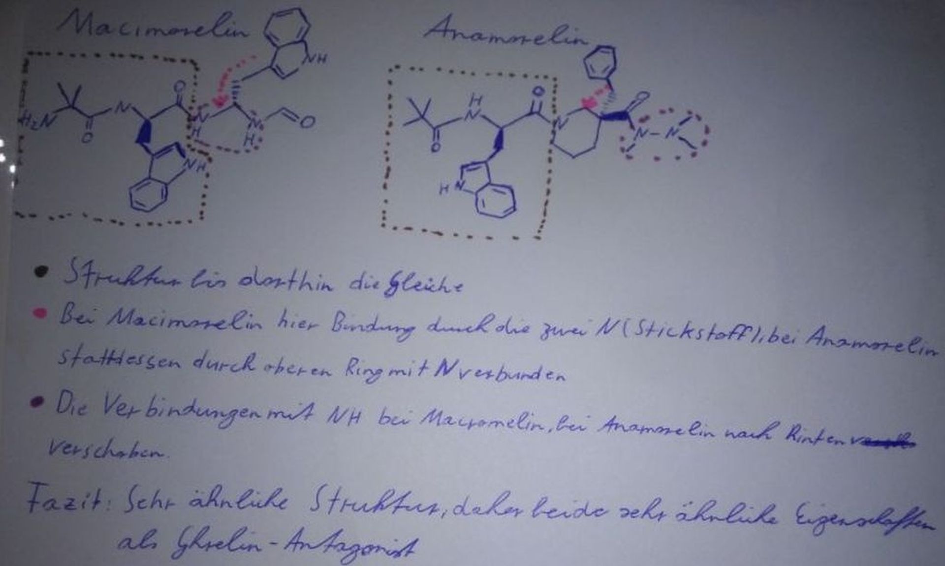 Die weit entwickelsten sind momentan Macrilen und Anamorelin. Beide sind Phase 3 Medikamente. Es gibt weitere Studien zu Ghrelin-Antagonisten, aber diese wurden großteils wegen der geringen Wirksamkeit abgebrochen. Da hab ich mir die Frage gestellt warum? Die Begründung liegt für mich in der sehr ähnlichen Molekülstuktur, also der Aufbau des Moleküls ähnelt sich sehr stark.