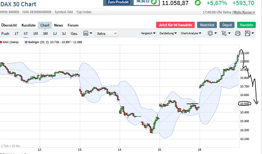 Mir fehlen die Worte, wenn ich ehrlich sein soll. Das Erreichen der 10800 war absehbar, aber eine Tagesschlusskurs über der 11000, das ist schon eine deutlichst bullishe Ansage. Plötzlich sind sogar 11200 nicht mehr weiter entfernt. Habe soeben ein letztes Mal Short bei 11063 aufgestockt. Durchschnittlicher Kaufkurs nun bei 10781.