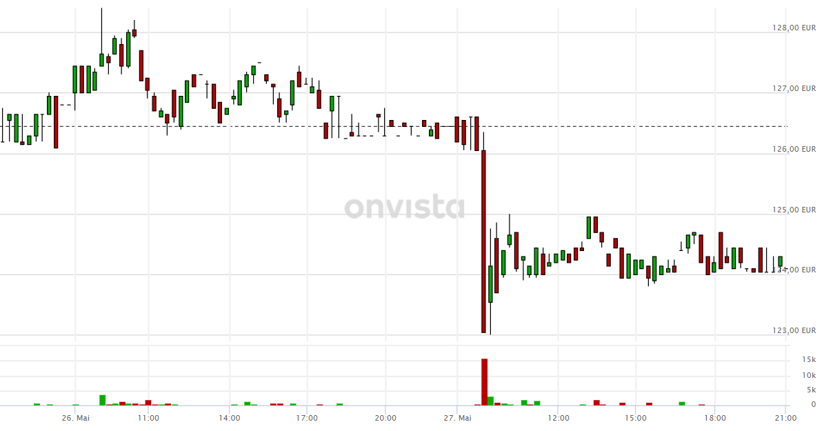 meine Prognose für Morgen: Ähnlicher Verlauf, direkt am Anfang ein großer Batzen (>10.000 Stück) auf den Markt und wir sind bei unter 120 Euro dann den ganzen Tag kein richtiges Volumen mehr. Ich hatte, nachdem der Kurs zweimal an der oberen Grenze von 127 Euro abgeprallt ist eine Short-Position aufgemacht. Mal schauen ob es wirklich so kommt wie ich mir das denke.