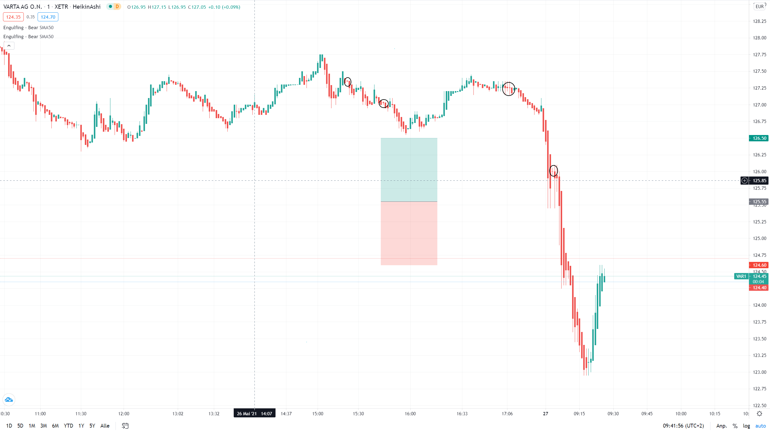 In der Nahaufnahme zeigt sich aber ein Varta-typisches Tradingmuster, das auch im großen Stil hier funktioniert. Das bearish engolfing ankert hier regelmäßig bei an den körperlosen Dojis.