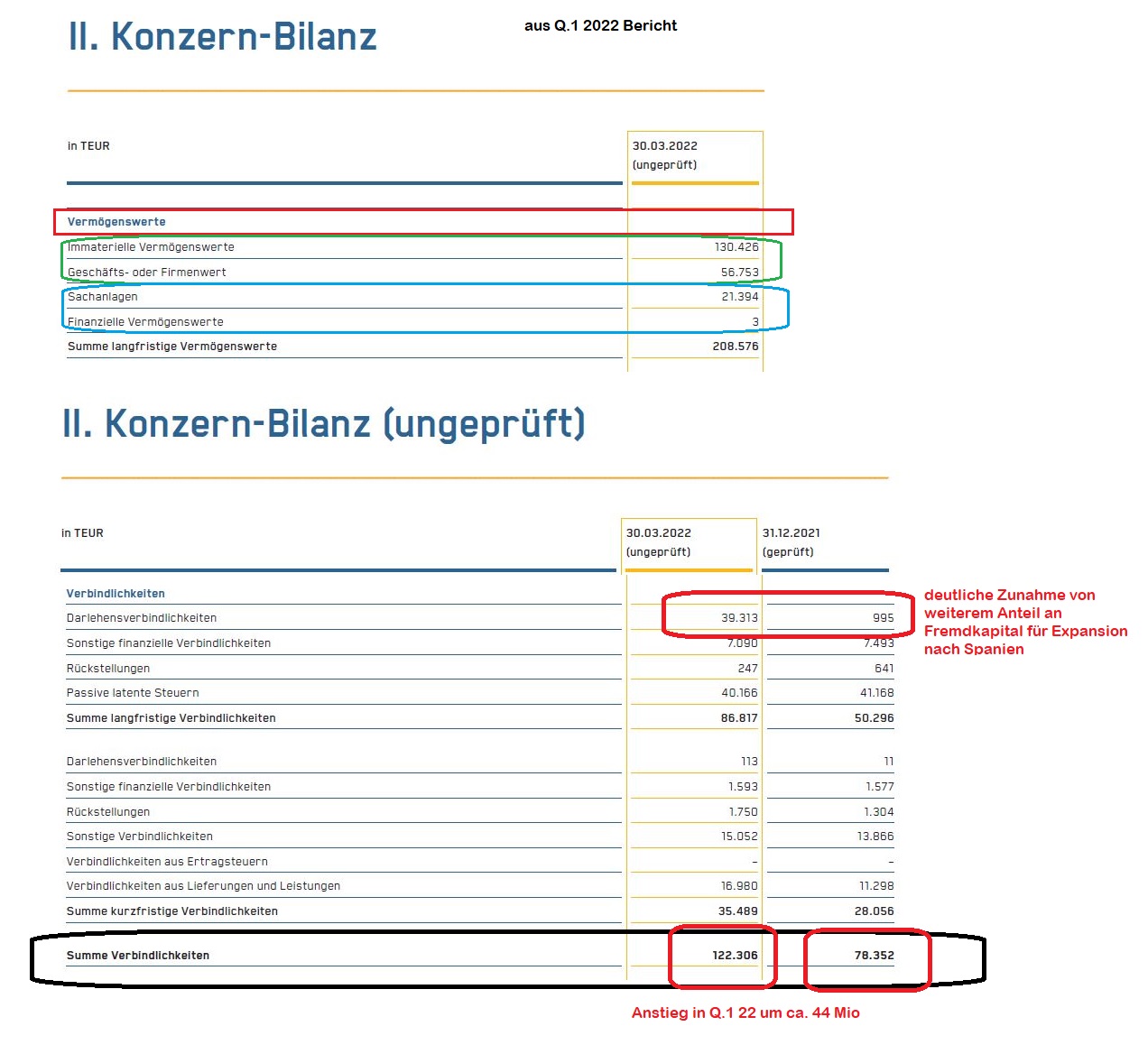 Da man die Expansion nach Spanien offenbar im wesentlichen mit neuen deutlich ausgeweiteten Schulden / Verbindlichkeiten bzw. noch mehr Fremdkapital stemmt (siehe die massive Veränderung der Darlehen-Schulden in Q1 21 ) , sieht die Bilanz dann am Ende noch ungesünder aus. Wenn man sich ohnehin die Bilanz mal anschaut, dann ist sowieso ein großer Teil der Vermögenswerte lediglich bestehend aus immateriellen Vermögensgegenständen / Goodwill. Wirklich harte Substanz / Sachanlagen hat die Firma garnicht so viel ( => im Falle einer Inso / Zerschlagung kann man den immateriellen Kram zum großen Teil wohl knicken zum bedienen der Gläubiger). Entsprechend könnten dann auch Banken irgendwann nurnoch ungerne weitere Kredite rausrücken bzw. nurnoch mit dann deutlich höheren Risiko-Zinsen. Was wäre die Alternative? Deutlich verwässernde KE bei einem extrem gefallenen Aktienkurs? Wäre auch keine schöne Vorstellung. Also vielleicht beim Thema Expansionen etwas mehr auf die Bremse treten (wenn man nicht genug eigenes Geld hat) und dafür erstmal das bestehende Geschäft so stark machen, daß man eine gesündere Mischung wieder findet.