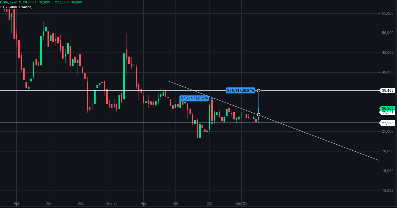 Anfang Februar 2024 gelang es der Aktie, den langfristigen Abwärtstrend zu überwinden und es kam zu einem Pullback bis an die gebrochene Trendlinie. Von da an konsolidierte die Aktie noch leicht abwärts, tauchte aber nicht mehr in den alten Trend hinein. Die Käufer nutzten die günstigen Kurse bei ca. 23 Euro zum Einstieg und trieben den Kurs im Oktober 2024 bis auf ca. 33 Euro. Seitdem konsolidierte die Aktie bis Ende Februar 2025 in einer dreieckigen keilförmigen Bewegung. Am 26.02.2025 kam das langerhoffte Kaufsignal. Die Aktie brach aus dem Keil aus und eröffnet jetzt ein rechnerisches Kursziel bis ca. 35,50 Euro. Dieses Ziel stellt auch den nächsten Widerstandsbereich dar, welcher ab Mai 2023 ausgebildet wurde.
