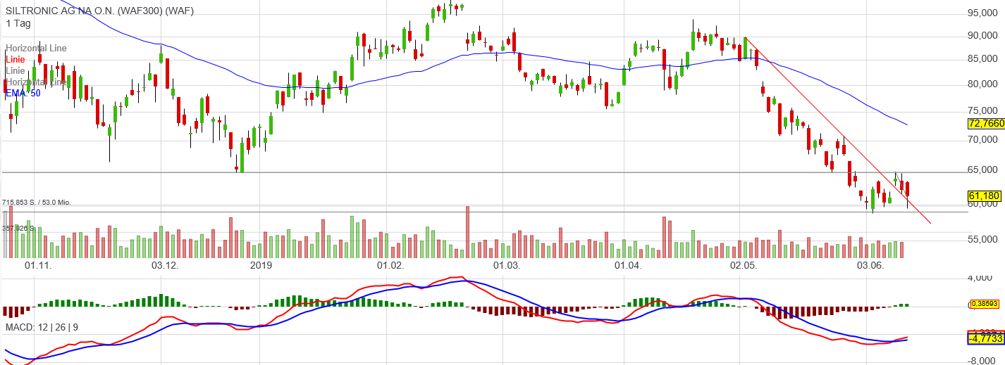 Siltronic Aktie weiterhin im freien Fall . Kurs aktuell= 58,96€