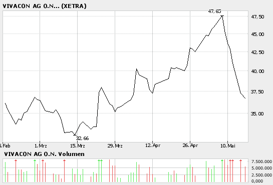 "Für die Vivacon-Aktie sehen die Experten der "EURO am Sonntag" ein Kursziel von 44 Euro. Anleger sollten zur Absicherung einen Stoppkurs bei 32 Euro platzieren."