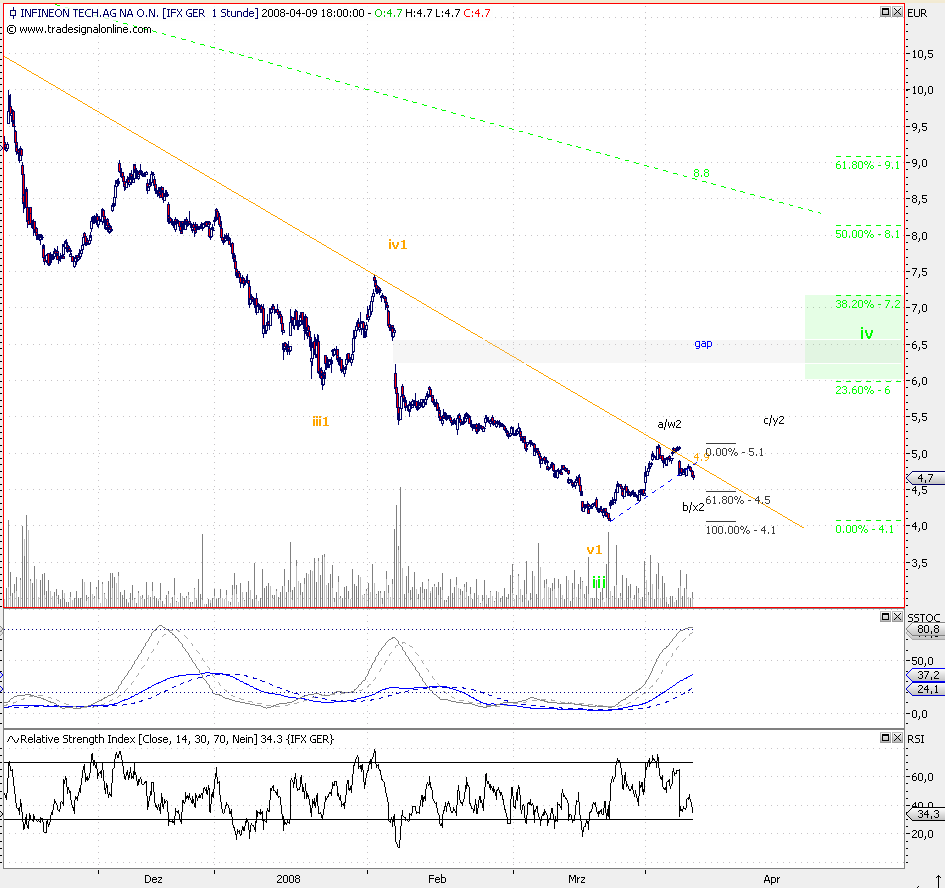 Alternativ kann der Start eines Aufwärtsfünfers nicht ausgeschlossen werden, dann sollte die IFX in der Welle iii2 aufwärts beschleunigen und die Marke 6,3 überwinden. Dies wird immo jedoch nicht favorisiert.