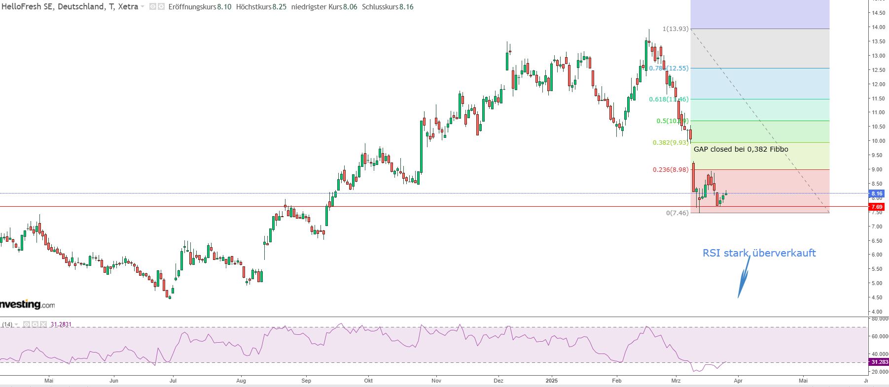 Das finde ich übertrieben, deshalb bin ich eben bei € 8,09 eingestiegen... den Stopp setze ich (nur im Kopf) bei € 7,75 und mein Kursziel wäre bei € 10,80. Das sollte nicht übertrieben sein - also den Aktienkurs, den Hellofresh Anfang des Monats noch hatte.