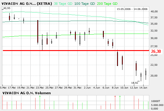 Nach der geplatzten IPO und der Auflösung der geplanten Zusammenarbeit mit dem Pensionfond stürtzte die Vivacon von 49,48 auf 18,92 (intraday am 13.6.06) ab und stiegt bis auf 23,78 (intraday am 21.6.06)