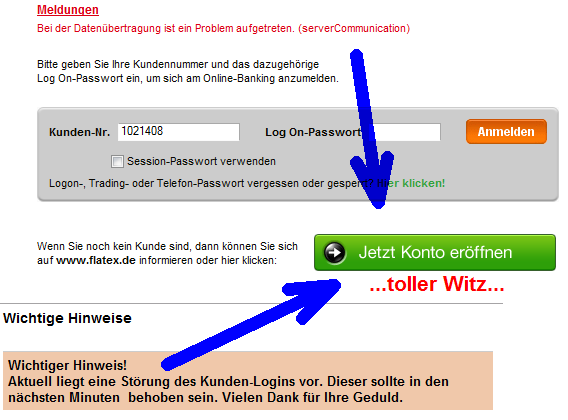 Ich hatte es schon mehr mal geschrieben, es ist nicht der brocker, sonder die Bank die hinter dem brocker steht, ich bin bei etrade (die es bald nicht mehr gibt) & siehe da auch heute so ab 15,45 Fehler beim ermitteln der order & welche Bank steckt hinter etrade , genau der selbe wie bei flatex – nämlich die biw-bank, & im zeit alter der super Computer ist das Problem bestimmt nicht technischer natur, macht euch einfach mal den Spaß zu schauen wann ihr nicht in den markt kommt, aus meiner Erfahrung komischer weise fast immer in hoch oder tief,s Zufall, dann zählt mal die Zufälle & ihr werdet ein nicht mehr lustiges Verhältnis kriegen.