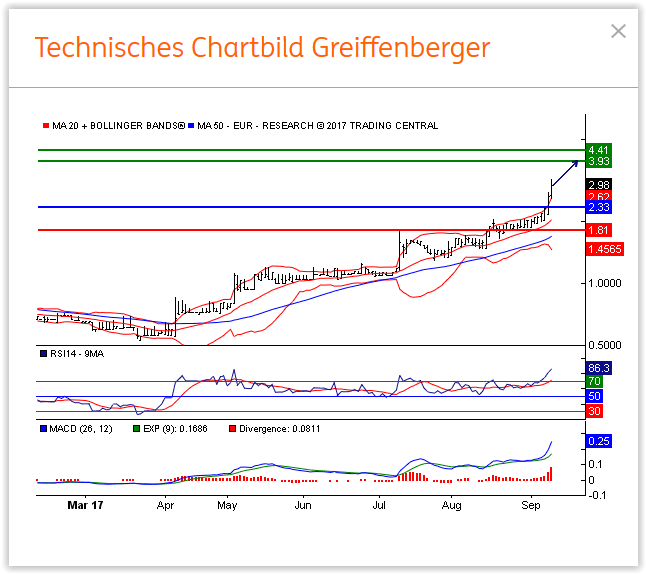 Gerade was die Perspektive angeht, könnte eine Bestätigung der getroffenen Prognose für das Gesamtjahr 2017 mit einer sehr deutliche Umsatzsteigerung und einer deutlichen, im Verhältnis zum Umsatz spürbar überproportionale Steigerung des Ergebnisses aus dem operativen Geschäft, zu weiter steigenden Kursen führen. Besonders wichtig wäre, dass Greiffenberger kontinuierlich solide Gewinne erwirtschaftet, damit die Eigenkapitalbasis erhöht und so langfristig die Position am Kapitalmarkt verbessert. Alle Mitteilungen aus dem Juni sprechen dafür und stimmen mich für die mit Spannung erwarteten Zahlen für September zuversichtlich.