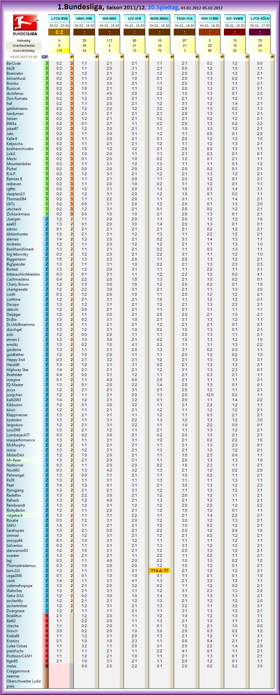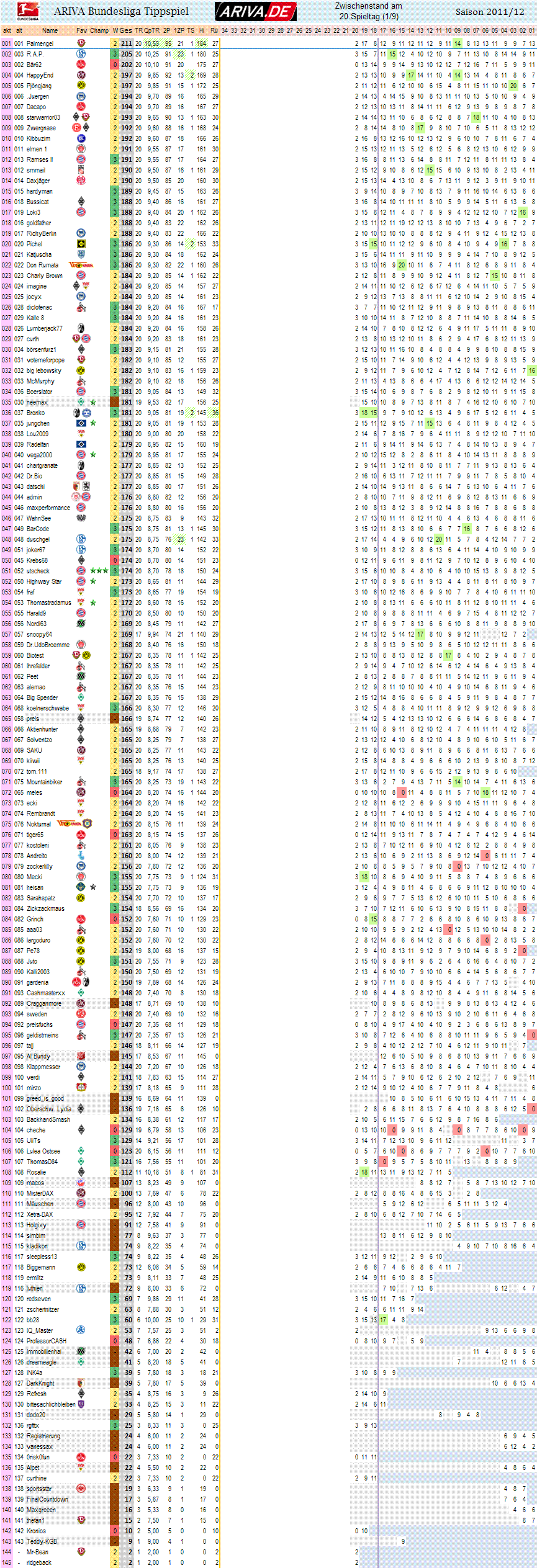 ..nun 90 Tipper "entschlüsselt" verteilt über jeweiligen Teilnahmehorizont.. wird weiterhin aktualisiert.. 10Jahre BL Spiel, dat muß brummen auf dem Rechner und Statistkihighlight werden.. ;o)) Also die nä Spieltage wirds davon sozusagen immer die jeweilige Top100 geben als übersicht der je 3 Tabellen.. 2, 3 oder 5 Jahre rückwirkend..