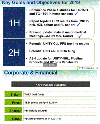 TG Therapeutics ist ein biopharmazeutisches Unternehmen, das sich auf die Akquisition, Entwicklung und Vermarktung neuartiger Therapien für B-Zell-Malignome und Autoimmunerkrankungen konzentriert. Derzeit entwickelt das Unternehmen zwei Therapien, die auf hämatologische Malignome und Autoimmunerkrankungen abzielen. Ublituximab (TG-1101) ist ein neuer, glykoengineerter monoklonaler Antikörper, der auf ein spezifisches und einzigartiges Epitop des CD20-Antigens in reifen B-Lymphozyten abzielt. TG Therapeutics entwickelt auch Umbralisib (TGR-1202), einen oralen, einmal täglich verabreichten Inhibitor von PI3K-Delta. Umbralisib hemmt in einzigartiger Weise CK1-Epsilon, wodurch bestimmte Verträglichkeitsprobleme, die mit PI3K-Delta-Inhibitoren der ersten Generation verbunden sind, überwunden werden können. Sowohl Ublituximab als auch Umbralisib oder die Kombination davon, die als "U2" bezeichnet wird, befinden sich in Phase 3 der klinischen Entwicklung für Patienten mit hämatologischen malignen Erkrankungen, und Ublituximab befindet sich ebenfalls in Phase 3 der klinischen Entwicklung für Multiple Sklerose. Darüber hinaus hat das Unternehmen kürzlich seinen monoklonalen Anti-PD-L1-Antikörper TG-1501 sowie seinen kovalent gebundenen Bruton-Tyrosinkinase- (BTK-) Inhibitor TG-1701 und seinen bispezifischen Anti-CD47 / CD19-Antikörper auf den Markt gebracht , TG-1801, in Phase 1 der Entwicklung und zielt darauf ab, in Zukunft zusätzliche Pipeline-Assets in die Klinik zu bringen. TG Therapeutics hat seinen Hauptsitz in New York City.