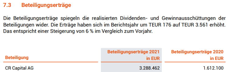 die dividenden der CR Capital AG erscheinen daher auch im konzernabschluss der MPH (siehe MPH-geschäftsbericht 2021, seite 53, unter "7.3 Beteiligungserträge": aktiendividende der CR Capital AG für 2020 [1,50 je aktie]: 3.288.462 EUR [= 0,77 EUR je MPH-aktie])