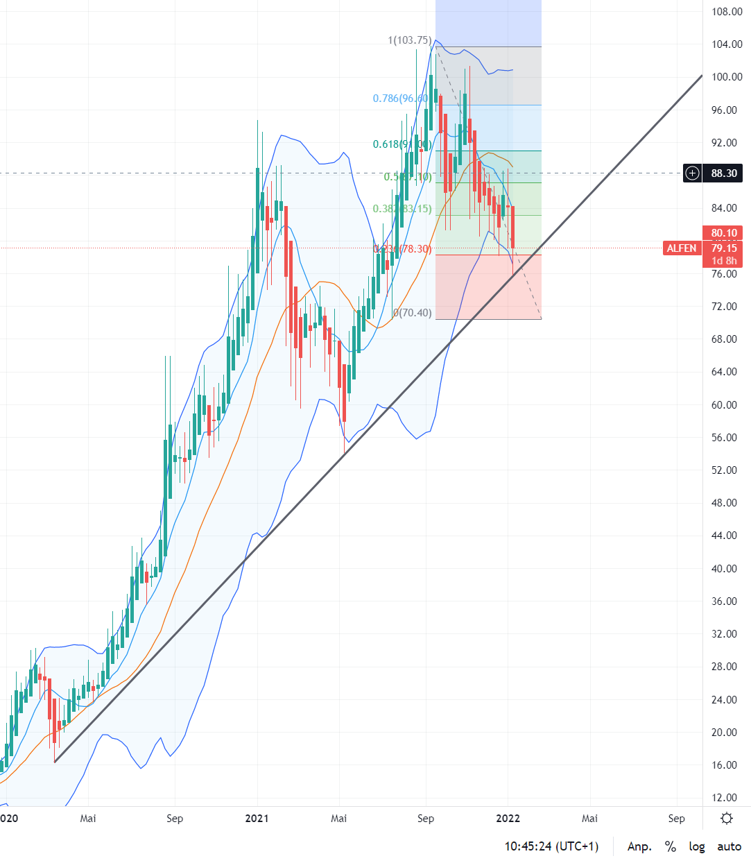 Die Doji deuten noch eine Verlängerung des Upmove an. Bei einer bullischen Fortführung würde ein Zurückkommen bei 84 – 85€ in die Bollinger Mitte und für die Auffüllung des Tassenpatterns ein Abknicken bei 87- 88€ in das untere Bollinger dazugehören.