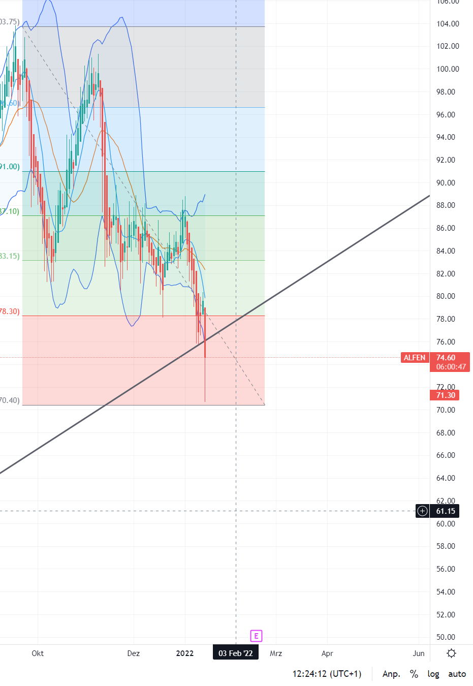 Vor dem 16.02. wird der Kurs sich u. U. an diese Achse schmiegen, trotzdem kann er noch das Retrace vollmachen. Bildet sich da der Boden, empfiehlt sich 70 – 75.-€ als Einkaufsband.