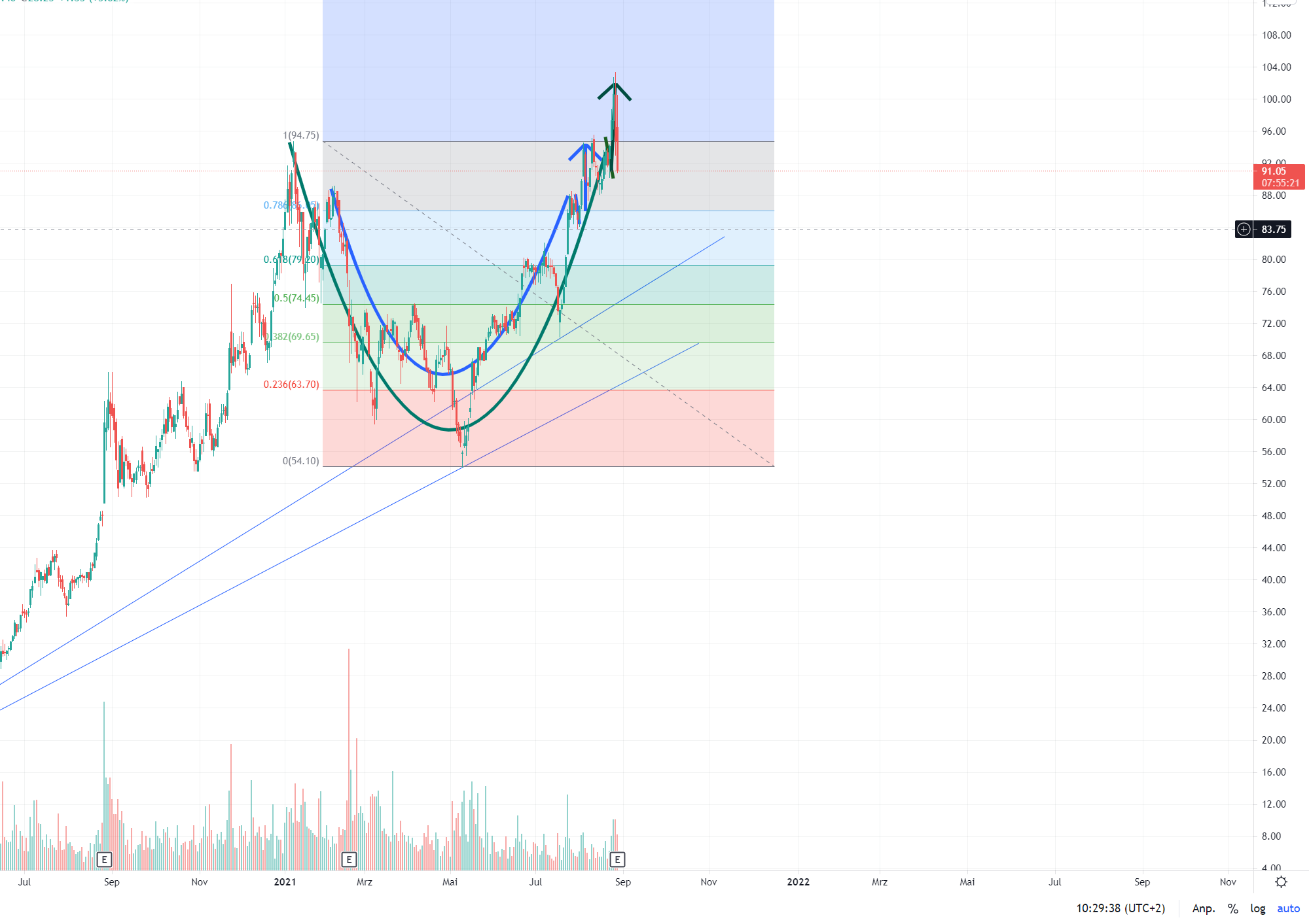 Nach einem solchen Lauf mit zwei in einander eingelagert Cup and handles, ergibt sich aus dem Chart für einen bereinigenden Rücklauf eine Spanne von 16,7% bis 31 %.