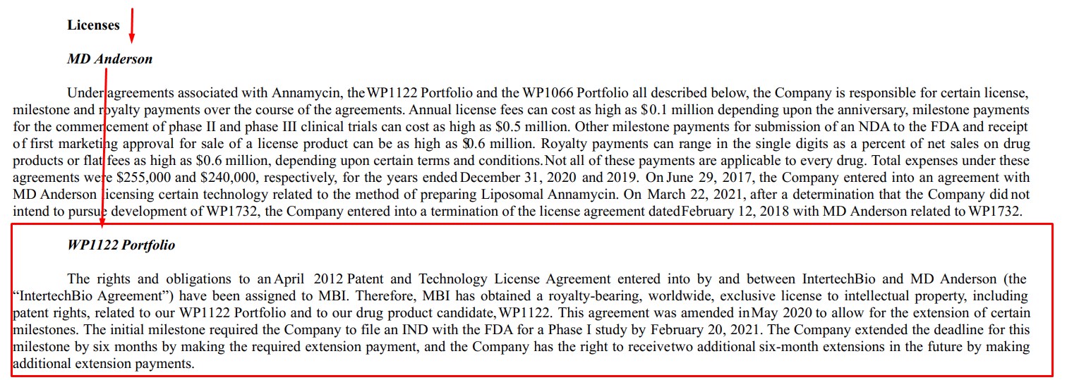 " ... Diese Vereinbarung wurde im Mai 2020 dahingehend geändert, dass sie eine Verlängerung einer bestimmten Meilensteinverpflichtung vorsah und uns erlaubte, diesen Meilenstein auf unseren Antrag und gegen Zahlung einer Verlängerungsgebühr zu verlängern. Der ursprüngliche Meilenstein verlangte von uns, bis zum 20. Februar 2021 einen IND-Antrag für eine Phase-I-Studie bei der FDA einzureichen. Wir haben die Frist für diesen Meilenstein um sechs Monate verlängert, indem wir die erforderliche Verlängerungszahlung geleistet haben, und Wir haben das Recht, in der Zukunft zwei weitere sechsmonatige Verlängerungen zu erhalten, indem wir zusätzliche Verlängerungszahlungen leisten..."