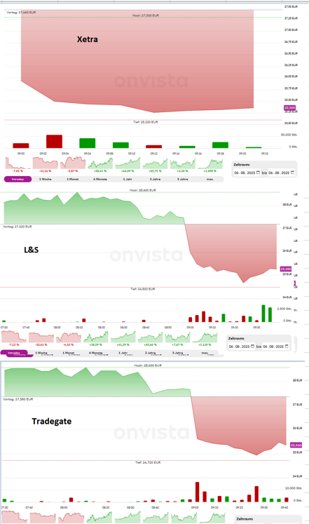 Die Profis mögen sie anscheinen­d dennoch nicht. Hohe Volumen auf Xetra, während Kleinanleg­en vorbörslic­h noch bereit waren bis zu 28,60 zu zahlen