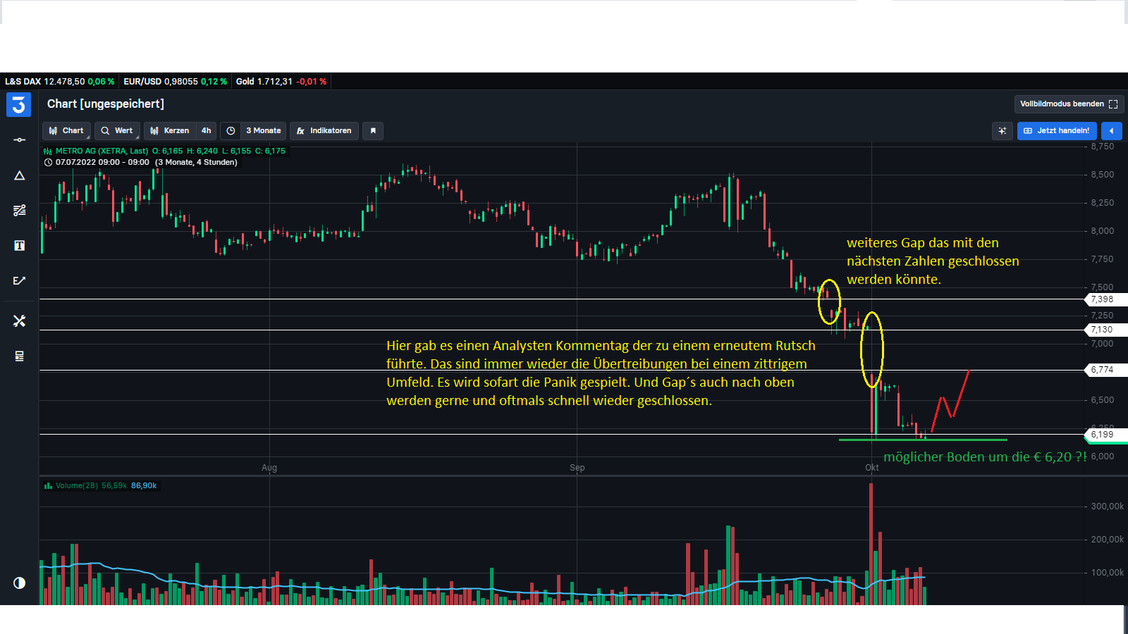 Hier zu sehen das man Heute mit einem SK um oder über € 6,20.- aus dem Handel gehen sollte. Dann könnte mit einer Wochenkerze ein möglicher Boden bestätigt worden sein. Wäre dann möglich das eine kleine Rally starten könnte. Erstes Zwischenziel € 6,60.- danach schnell auf 6,77.- danach mögliche kleine Korrektur bevor man das GAP bei € 7,13.- schließen könnte.