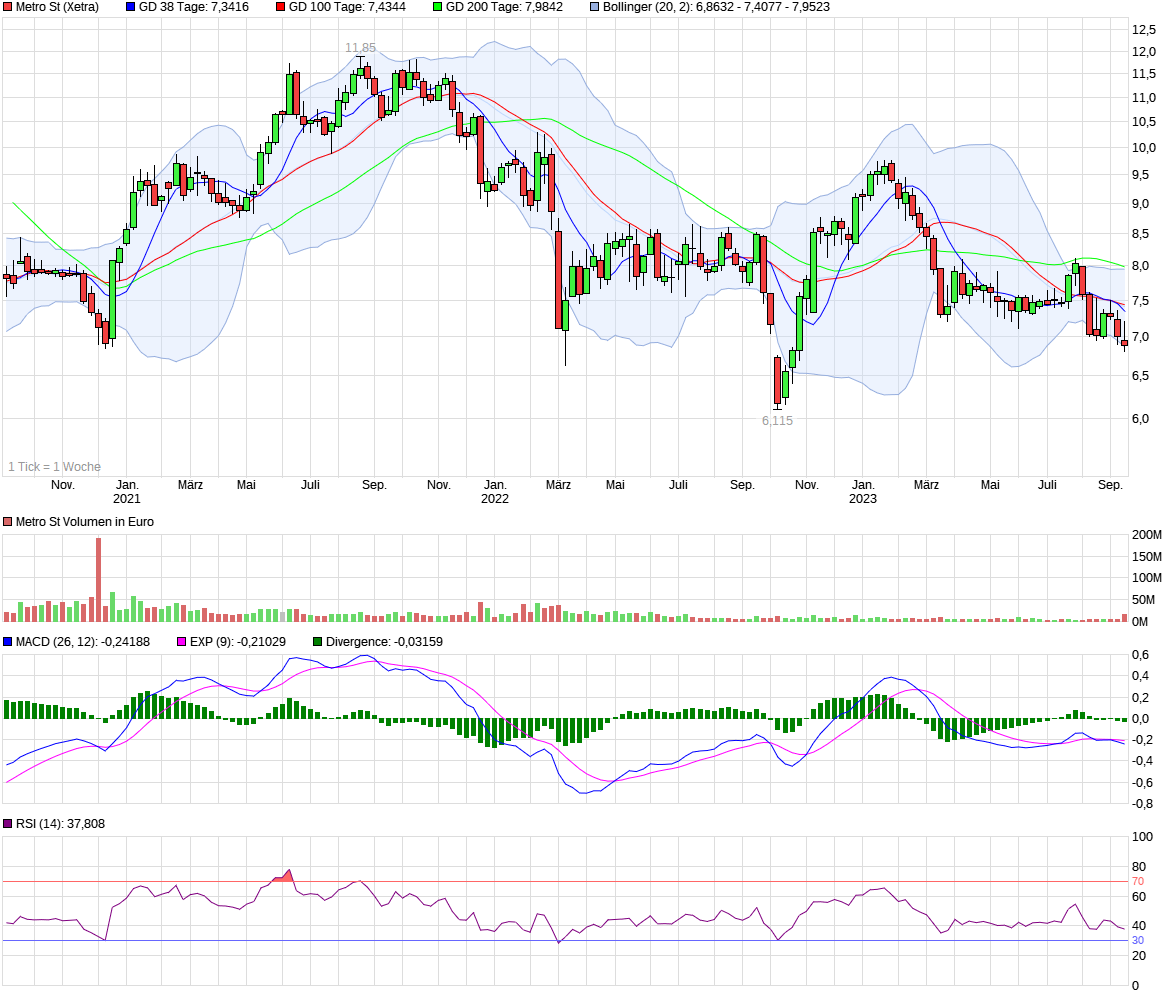 Das Orderbuch ist gut mit Kaufaufträgen gefüllt. Die letzte Woche hat man Metro regelrecht verprügelt. Zuvor schon von € 8.- auf € 7.- war extrem. Für mich ein klarer Kauf Kandidat denn mit den nächsten Zahlen/Aussichten sollte es zusätzlich zu den technischen Indikatoren etwas Rückenwind geben.