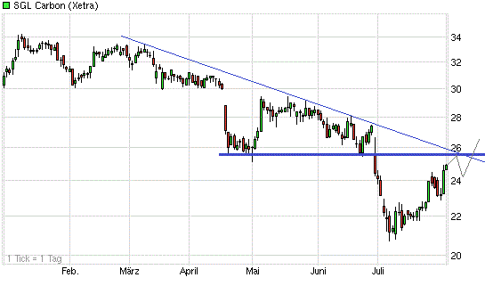 Doch nun nähert sich eine wichtige Chartmarke, die einen schwer knackbaren Widerstand darstellen dürfte: der Kreuzwiderstand bei rund 25,50 Euro, bestehend aus den Verlaufstiefs vom April und Juni und dem Abwärtstrend seit März. An diesem Widerstand dürfte der Kurs zunächst abprallen und bis ca. 24,50 Euro zwischenkorrigieren. Denkbar wäre auch eine Korrektur auf ca. 23,- Euro.