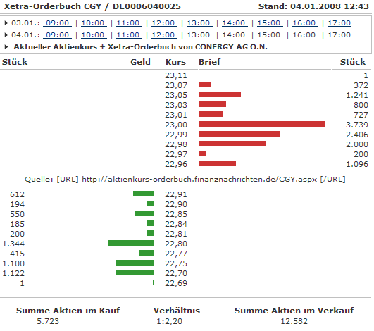Die Conergy-Aktie stieg in der Spitze um zwölf Prozent auf 23,11 Euro. Damit setzt das Papier den Versuch einer Bodenbildung nach dem drastischen Absturz im vergangenen Jahr fort.