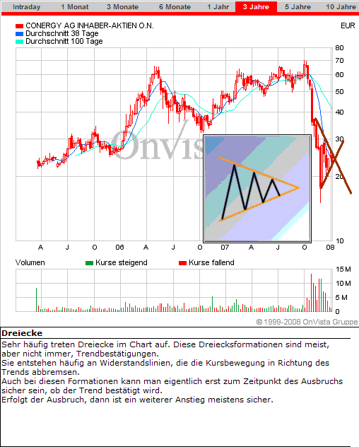 Gleichschenklige Dreiecke Die vorab angesprochene Unentschlossenheit der Marktteilnehmer manifestiert sich ganz besonders in einem gleichschenkligen Dreieck (engl. Symetric Triangle). Im Anschluss an eine starke Trendbewegung beginnt plötzlich eine Phase starker Kursschwankungen. Haussiers und Baissiers kämpfen also sichtbar um die Vorherrschaft. Doch nachdem sich keine klare Richtung durchsetzen kann, ziehen sich mehr und mehr Akteure vom Geschehen zurück. Die Kursausschläge werden geringer, gleichzeitig pflegen die Umsätze zu sinken. Bei conergy zeigt ein derartiges Dreieck im Kursverlauf . Aus diesen rückläufigen Kursfluktuationen heraus etablieren sich gleichzeitig eine Auf- und eine Abwärtstrendlinie, deren Steigungswinkel in etwa gleich sein müssen. Ansonsten würde eine Seite der Marktteilnehmer überwiegen, es würde sich um ein an- oder absteigendes Dreieck handeln. Je näher sich die Kurse der Spitze dieses Dreiecks nähern, desto zwingender wird die Notwendigkeit einer Entscheidung. Irgendwann wird entweder die Käufer- oder Verkäuferseite siegen. Dann wird die Trendbewegung fortgesetzt, oder es kommt zu einer Trendumkehr. Diese Formationen haben eine zeitliche Ausdehnung von sechs Wochen bis zu maximal einem Jahr. Wichtig: Die Wahrscheinlichkeit, dass der vorher beherrschende Trend fortgesetzt wird, ist nicht größer als die einer Trendwende! Oft wird auch versucht in solchen Phasen den Kurs charttechnisch in die ein oder andere Richtung zu Bewegen vor allem intraday, um Kauf oder auch Verkauforders auszulösen! Wichtig ist in solch einer Phase das geschehen zu beobachten ob große Stückzahlen, oder Kleine den Kurs in die ein oder andere Richtung bewegen! Oft sieht man ein Kurzes Durchbrechen in die ein oder andere Richtung, und dann erfolgt die Trendbewegung in die Entgegengesetzte! Investierte sollten die Ruhe bewahren, für die Anderen gilt erst danach einzusteigen (eventuell 1-2Tage abzuwarten)