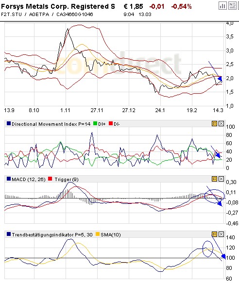 FORSYS METALS - Kaufmarke hat gehalten, jetzt... Datum 14.03.2008 - Uhrzeit 11:25 (© BörseGo AG 2007, Autor: Rain André, Technischer Analyst, © GodmodeTrader - http://www.godmode-trader.de/) WKN: A0ETPA | ISIN: CA34660G1046 | Intradaykurs: Forsys Metals - Kürzel: FSY - ISIN: CA34660G1046 Börse: Toronto in CAD / Kursstand: 3,05 CAD Quellenangabe: http://www.godmode-trader.de/hotstocks/ Rückblick: Die FORSYS METALS Aktie befindet sich seit dem Hoch bei 10,20 CAD im März 2007 in einer mittelfristigen Abwärtsbewegung. Nach einer Stabilisierung oberhalb des Unterstützungsbereichs bei 2,75 CAD pendelte die Aktie ab August 2007 mehrere Monate lang seitwärts, bevor Mitte Januar 2008 ein Rückfall unter 2,75 CAD erfolgte. Die Aktie rutschte deutlich bis 2,07 CAD ab und startete dort eine Kurserholung, welche zur Rückkehr über das Ausbruchslevel bei 2,75 CAD führte. Mit diesem Anstieg im Februar wurde das zuvor aktive Verkaufsignal wieder neutralisiert, die Aktie lief bis fast an den Widerstandsbereich bei 3,54 - 3,58 CAD. Anschließend setzte die Aktie zurück an die 2,75 CAD Marke, welche nun als Unterstützung dient. Aktuell prallt sie daran nach oben hin ab. Das kurzfristige Chartbild ist neutral, das mittelfristige noch leicht bärisch zu werten. Charttechnischer Ausblick: Die FORSYS METALS Aktie hat weiterhin die Chance auf eine größere Trendwende nach oben hin, so lange sie nur über 2,75 CAD notiert. Allerdings wäre dazu ein Bruch der mittelfristigen Abwärtstrendlinie bei aktuell 3,56 CAD nötig. Ein nachhaltiger Anstieg über 3,58 CAD würde größere Käufer locken und eine deutliche Kurserholung bis zunächst 5,43 - 5,65 CAD ermöglichen. Darüber wäre das Hoch aus 2007 bei 10,20 CAD Rutsch die Aktie hingegen wieder unter 2,70 CAD zurück, kippt die Stimmung wieder. Unter 2,60 CAD könnte dann. Verkaufsdruck könnte dann aufkommen und Abgaben bis 2,07 und 1,93 CAD erfolgen.