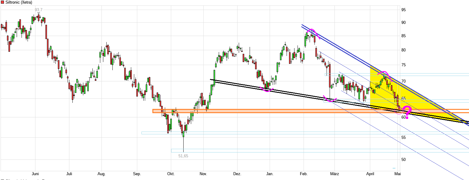 Kurs vorhin bereits bei 64,10 gewesen. Tja, mal schauen, ob die LV jetzt versuchen die Region 63,85/95 nach unten zu durchbrechen. Würde vermutlich SL auslösen. Darunter lägen dann wieder Unterstützungen bei ca. 62,5 und 61,5. Zumindest geht man diesmal schon vor den kommenden Zahlen deutlich runter beim Kurs. Entsprechend geringer sind dann auch bereits die Erwartungen bzgl. der Resultate/Prognosen. Das 1.Q. ist sicherlich nicht gut gelaufen aus bekannten Gründen, die Siltronic selber ja bereits verkündet hat. Die Geschäftskunden von Siltronic haben erhöhte Lagerbestände und die Endkunden dieser Geschäftskunden kaufen bislang in diesem Jahr weniger Geräte. Die Frage ist halt wie lange man in diesem Jahr noch diese ungünstigen Bedingungen/ schlechten Margen haben wird bzw. ob man bei Verkündung der nächsten Q. Zahlen schon einen kleinen Hoffnungsschimmer verkünden kann. Je ausgebombter der Kurs schon wäre vor den nächsten Zahlen, desto weniger genügt wohl schon an hilfreichen Aussagen zur weiteren Tendenz in 2023. Also mal schauen wie tief man stehen wird, wenn die Zahlen dann kommen. Am 5. Mai ist erstmal die HV. Auch da könnte vielleicht schon etwas erwähnt werden zu aktuellen Lage. Und am 11. Mai gibt es dann die Q1.23 Zahlen. Dann wird sich zeigen müssen wie schlecht die Lage wirklich war/ist/bleibt.