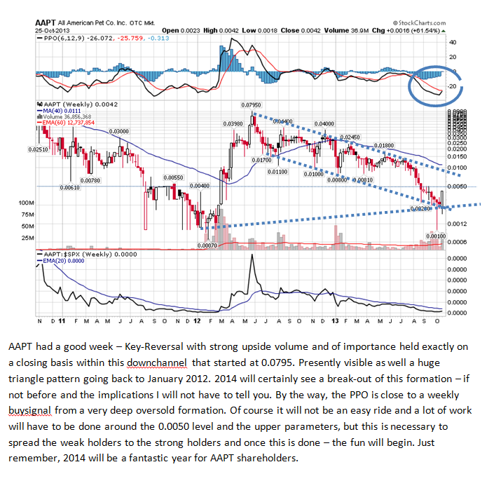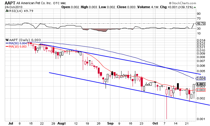 All American Pet Company, Inc. (OTCBB: AAPT) -- AAPT is working diligently­ with its strong new finance team, including its new VP of finance, to become current and compliant with its SEC and legal filings. Outstandin­g filings will be completed in the very near future. Our day to day operations­ people are pressing to catch up on all manufactur­ing, sales and marketing,­ fronts to secure a national retail presence.