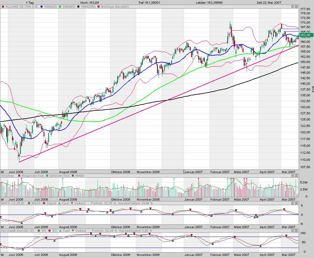 Nach dem erfolgreichen 1. Quartal sei die Allianz auf dem besten Weg, das gesetzte operative Ergebnisziel von 11 Mrd. Euro für das laufende Jahr zu erreichen. Der Titel sei in Verbindung mit der bisherigen Kapitalmarktentwicklung mit einer PE 2007e von 9,5 sowie einer Dividendenrendite von 3% weiterhin für einen europäischen Allfinanzkonzern nicht zu teuer.