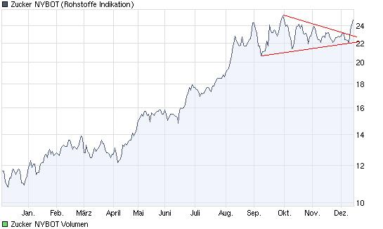 Im heutigen Handelsverlauf durchbrach Zucker den Keil nach oben hin. In der Spitze