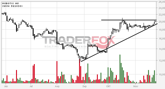 Ich habe mir in den letzten Tagen Mobotix genau angeschaut und nachdem der Aktionär einen Kurs von 27 Euro für wahrscheinlich hält, überlege ich mir eine Long-Position zu eröffnen. Mit einem 2013er KGV von 16 ist das Unternehmen für einen Wachstumswert recht moderat bewertet und anscheinend gelingt demnächst der Ausbruch aus der seit Mitte Oktober anhaltenden Konsolidierung. Der übergeordnete Aufwärtstrend ist noch in takt.