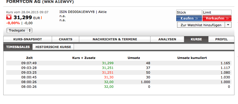 Gut, leider befanden sich die teuersten Stücke im Verkauf gleich einen dreiviertel Euro tiefer. Diese Stücke wurden komplett zu diesem tiefen Preis getauscht, wodurch der Preis der Aktie genau den Wert annahm.