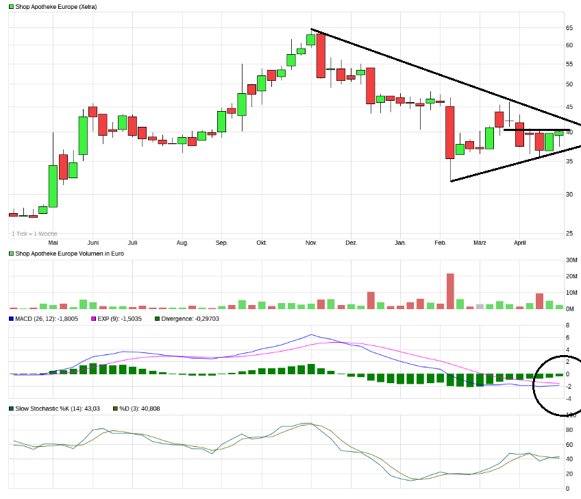 Charttechnisch könnte es jetzt bald interessant werden. Zum einem ist die 40 Euro Marke angelaufen worden welches gilt nachhaltig zu überwinden und zum anderen dreht der MACD schon etwas länger aber er steht bald vor einem Kaufsignal.
