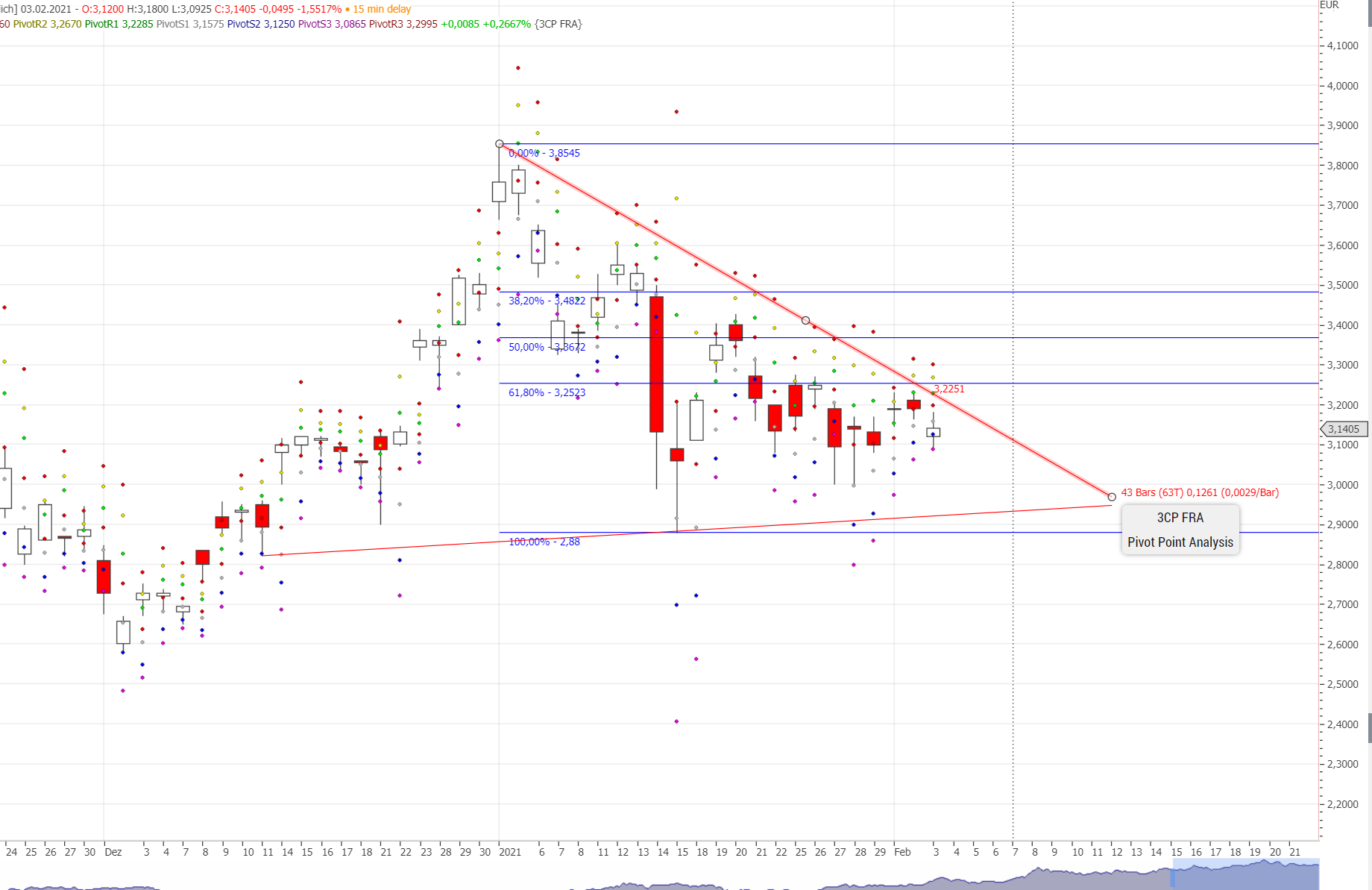 Heute mal mit deutschem Chart. Zeigt aber ein vergleichbares Bild. Der Wert baut Dynamik ab, das sieht man daran, dass er mehr an supply points als an den resistent points rumeiert.