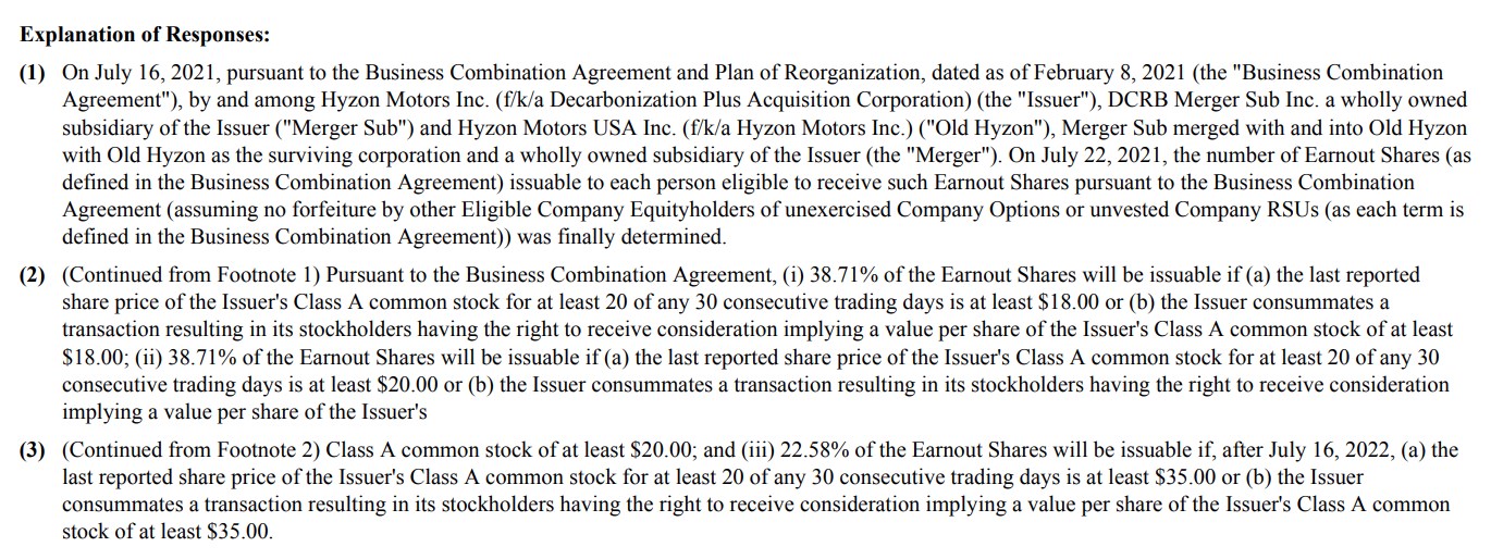 " ... 1. Am 16. Juli 2021 wurde gemäß dem Business Combination Agreement und Reorganisationsplan vom 8. Februar 2021 (das "Business Combination Agreement") zwischen Hyzon Motors Inc. (auch bekannt als Decarbonization Plus Acquisition Corporation) (die "Emittentin"), DCRB Merger Sub Inc. eine hundertprozentige Tochtergesellschaft der Emittentin ("Merger Sub") und Hyzon Motors USA Inc. (auch bekannt als Hyzon Motors Inc.) ("Old Hyzon"), fusionierte Merger Sub mit und in Old Hyzon, wobei Old Hyzon die überlebende Gesellschaft und eine hundertprozentige Tochtergesellschaft der Emittentin ist (die "Fusion"). Am 22. Juli 2021 wurde die Anzahl der Earnout-Aktien (wie
