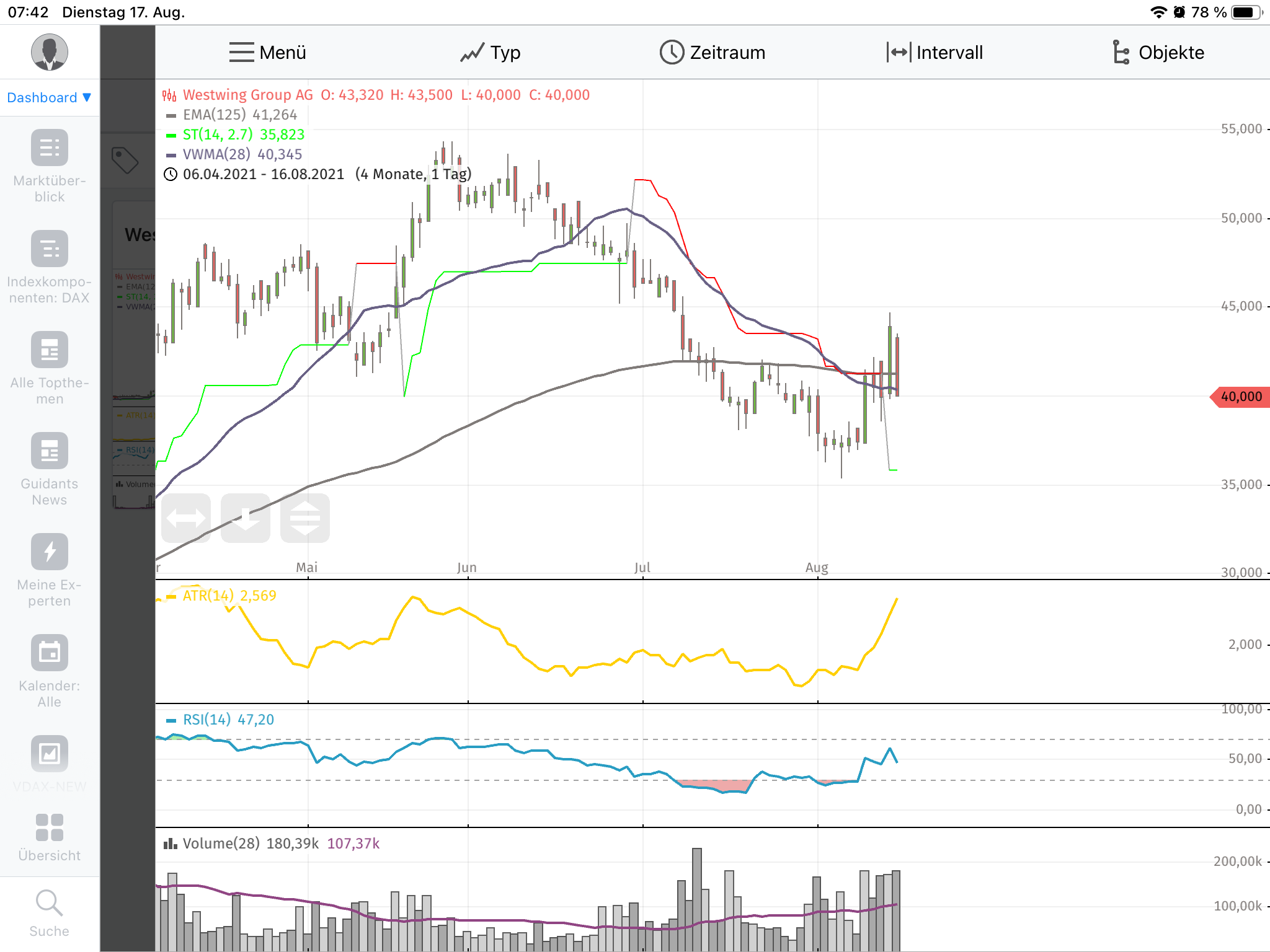 heute ordentlich Open End-Turbo-Optionsscheine auf die Westwing Group gekauft, vorher einige Turbos auf HF verkauft. 28,6 % seines Depots machen inzwischen die WW Turbos aus, dazu kommen dann noch einmal zirka 6,6 % an WW Aktien. Da ist sich jemand ganz schön sicher. Gerade an Tagen wie heute langen einige Profis halt zu. Über 3,2 Millionen Euro sind in seinem Wiki investiert. Bei allem Wortgeplänkel zu WW sollte man auch so etwas nicht außer acht lassen. Kaufen wenn die Kanonen donnern, fällt mir dazu ein. Baerenstark hat scheinbar Eier aus Stahl, bei dieser einseitigen Gewichtung würde ich verrückt werden. Respekt. Ich hoffe das Risiko wird belohnt.