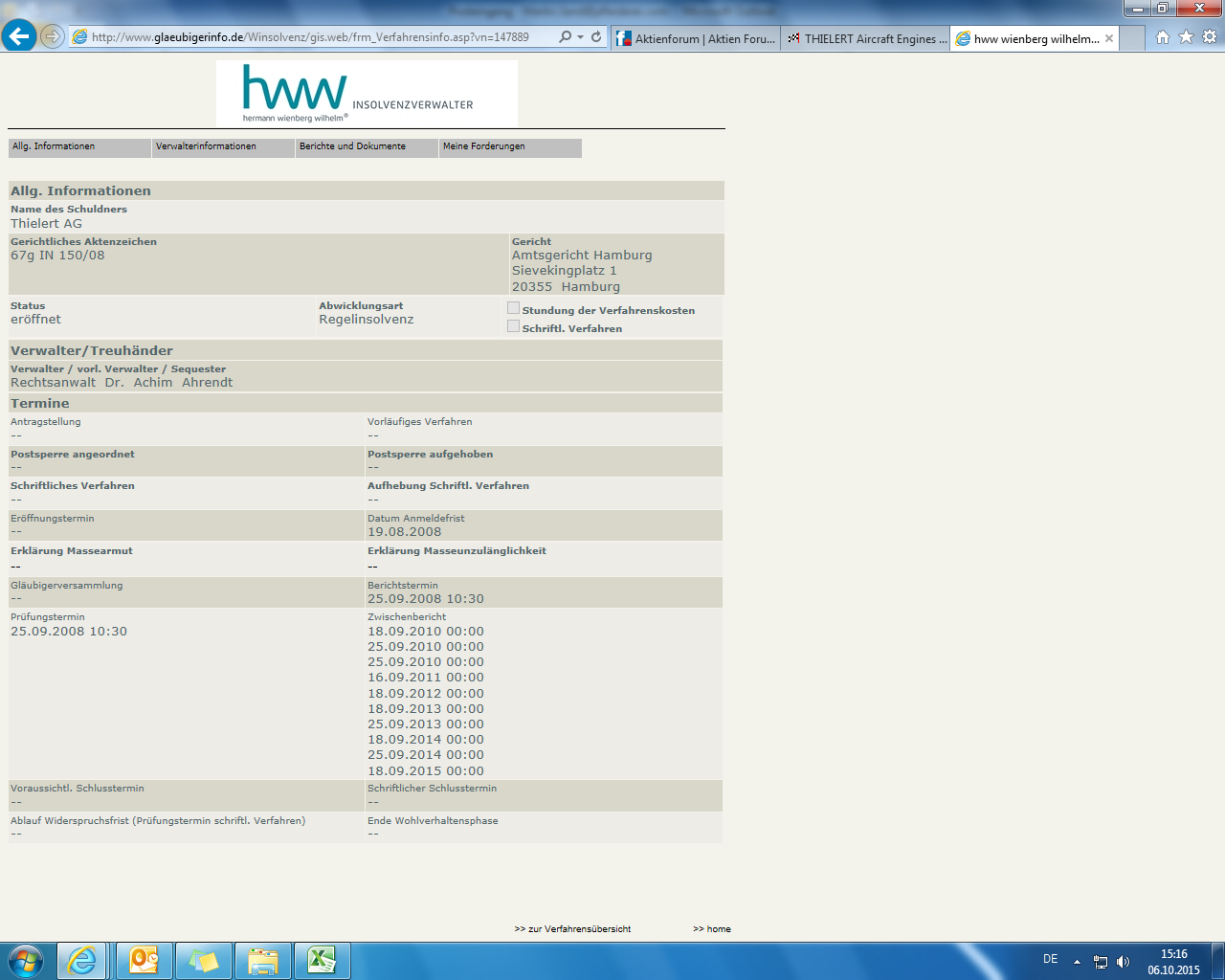 Hier ein Screenshot des Gläubigerinformationssystems von H. Dr. Ahrendt bezüglich Thielert AG.