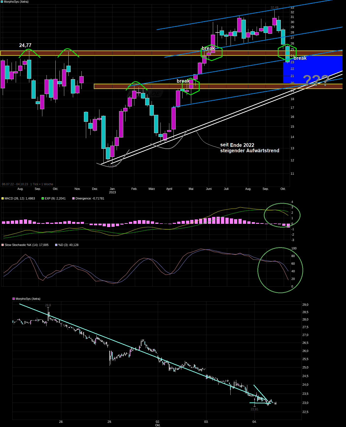 Bis dahin aber vielleicht noch weiter Verunsicherung in Good old Germany. Daher heute vielleicht nochmal neue Tiefs bei Morphosys und Abarbeitung des Korrekturziels 22,2 € der 200 TageLinie, bevor wir dann völlig überverkauft nach oben drehen. So jedenfalls mein Wunschszenario. :)