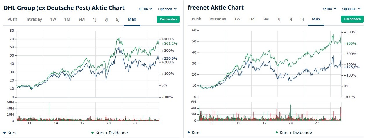 Mal angenommen, man hätte vor langer Zeit in Deutsche Post (später DHL) und Freenet investiert, dann wäre aktuell der reine Kurswert der DHL Aktien deutlich besser, mit Dividenden + Kurswert gerechnet wäre Freenet knapp besser, hätte man die DHL- und die Freenet-Dividenden jeweils in die gleiche AG reinvestiert, dürfte Freenet einen deutlichen Vorsprung der Gesamtrendite erbracht haben (um es genau zu beziffern müßte man eine kleine Tabelle mit den historischen Dividenden und Kursen füttern).