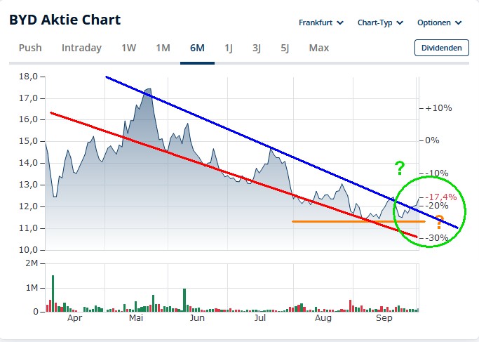 Ist das "heute" der "endgültige" Ausbruch aus dem Abwärtstrend der letzten Monate, oder ist es nur ein kleiner Zacken und die Linien dienen nur der Verwirrung und es geht noch gen 11,11€ nach diesem Aufwärtszacken? (Quelle https://www.finanzen.net/aktien/byd-aktie )