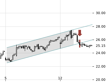 Zwischenzeitlich wurde das Verkaufssignal scharf gestellt, der Aktienkurs steht mittlerweile bei 24,96 EUR. Das mögliche mittelfristige charttechnisch ermittelte Korrekurziel liegt bei 14,88 EUR."