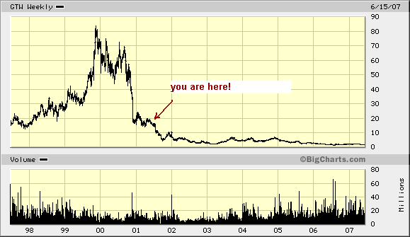 Wie das bei AMD ausgeht, weiß niemand. Dass sie "in 4 Jahren", wie Wally schreibt, "3 mal mehr wert" sein wird, ist ebenso möglich wie ein weiterer Chartverlauf à la Gateway ab 2001: Die Gateway-Aktie hatte sich gerade, wie jetzt die von AMD, in nur einem Jahr gedrittelt. Ein Kauf war sie trotzdem nicht. Sie fiel seitdem von 20 auf jetzt 1,75 Dollar (unten). (Bei Gateway erwäge ich ebenfalls Long-Einstieg, siehe mein Thread.)