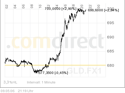 wohl doch richtig. Gold kratzt wieder an der 700 Dollar Marke. Dieses Mal von oben. Uff...