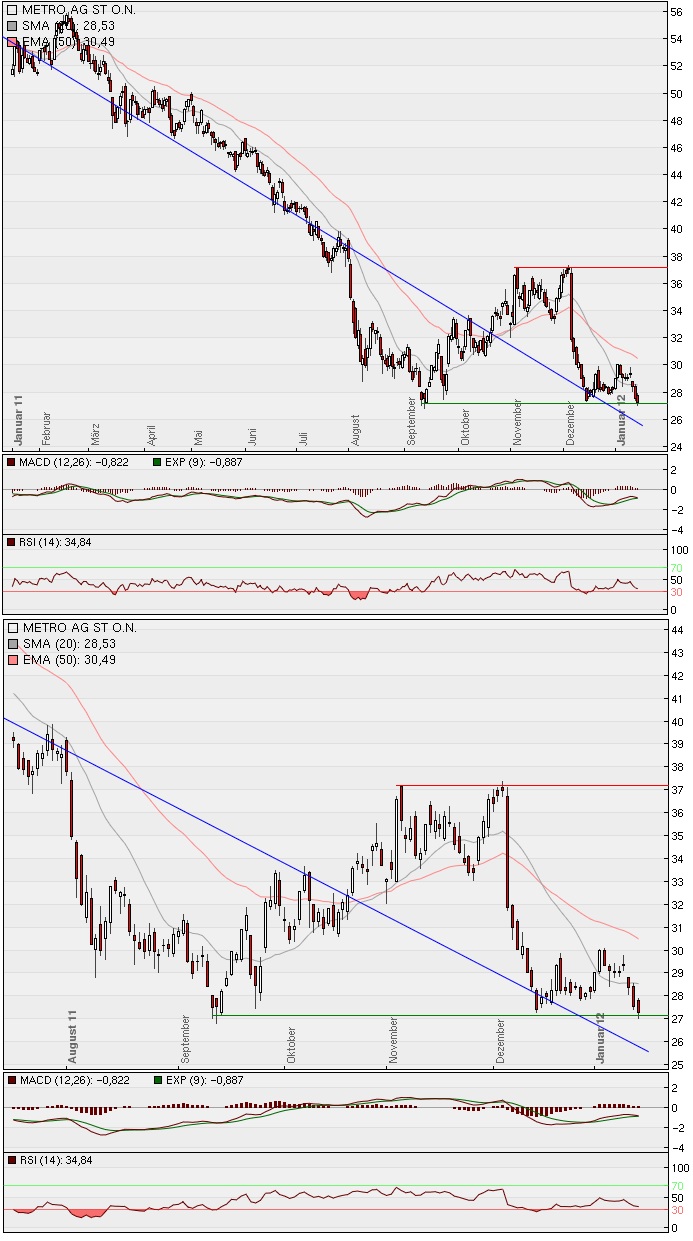 Bin mal für 27,17 rein, mal sehen ob ich kurzfristig einen Gewinn machen kann. Die Aktie ist in den letzten Tagen doch sehr gefallen und müsste somit mal zu einer Gegenbewegung kommen, außer der Markt gibt am Mo wieder allgemein nach, dann kann sich die Metro Aktie auch nicht davor schützen. Da Sie aber so extrem gefallen ist, ist das Risiko von einem nochmaligen rießigen Einbruch doch sehr gering.