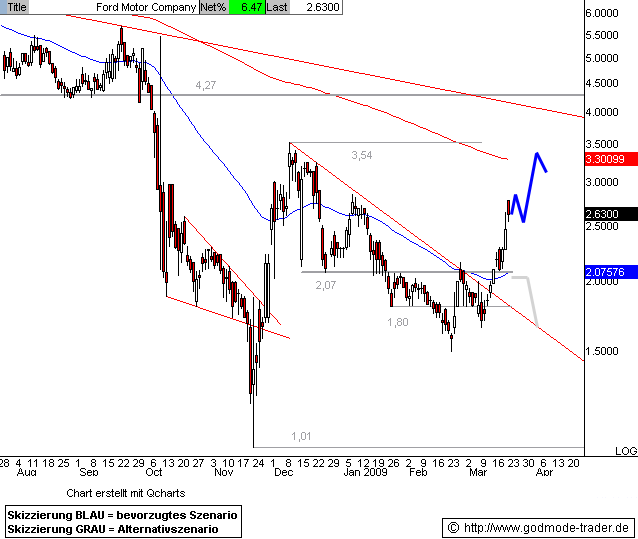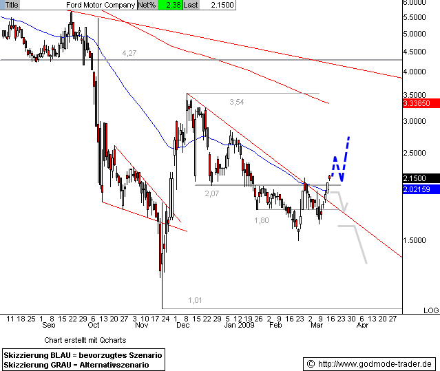 Rückblick:­ Die Ford Aktie tendiert seit dem Dezemberho­ch bei 3,54 $ abwärts und markierte bei 1,50 $ im Februar ein neues Jahrestief­. Ein Ausbruchsv­ersuch über den zentralen Widerstand­sbereich bei 2,07 - 2,10 $ scheiterte­ Ende Februar, heute springt die Aktie zu Handelsbeg­inn wieder über diesen Bereich.