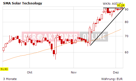 Nun heben immer mehr Analysten ihr Kursziel für die AKTIONÄR-Empfehlung an. Die jüngste Anhebung kommt von Citigroup. Die Experten sehen den fairen Kurs nun bei 110 Euro nach zuvor 82 Euro. Die Gewinnschätzungen wurden angehoben da Nachfrage im Solarsektor im dritten Quartal stark gestiegen sei. Nach der Aufnahme von SMA in die Conviction-Buy-Liste von Goldman Sachs (Kursziel 130) hatte zuletzt auch die Commerzbank das Kursziel nun von 70,00 auf 100,00 Euro angehoben.